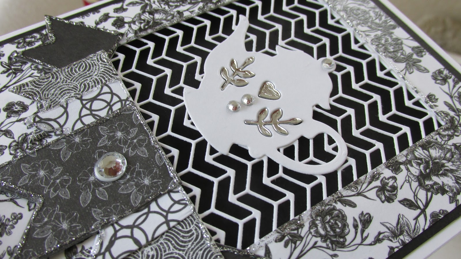 9. Die cut 2 teapots from the Tea Party die set - one silver and one white. Open the card so that any excess glue does not go on the black card.Thinly spread a little glue onto the white teapot and remove the excess by blotting on paper. Attach to the chevron diecut. Add the sliver leaves and heart from the silver teapot in the same way. Add gems to the teapot and lid.