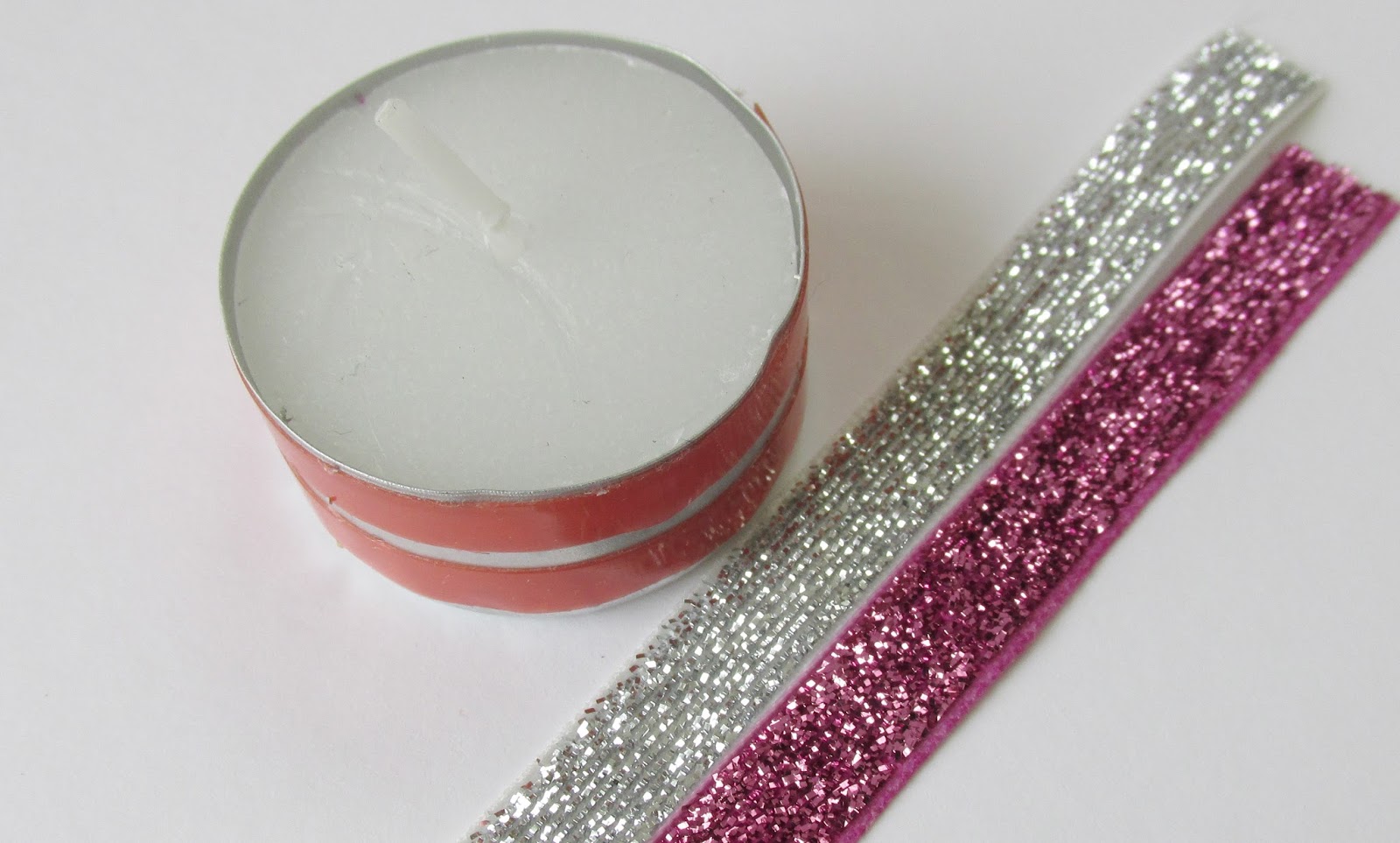 To decorate the tealights I found it worked best when the Permafix tape was applied to the outside of the tealight first - instead of applying it to the glitter ribbon.