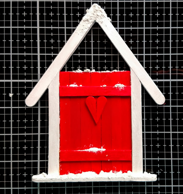 2. Use the cuttings from the lollipop sticks to make a little heart and glue this to the door. Paint the door frame white and the door red. Add some 3D snow.